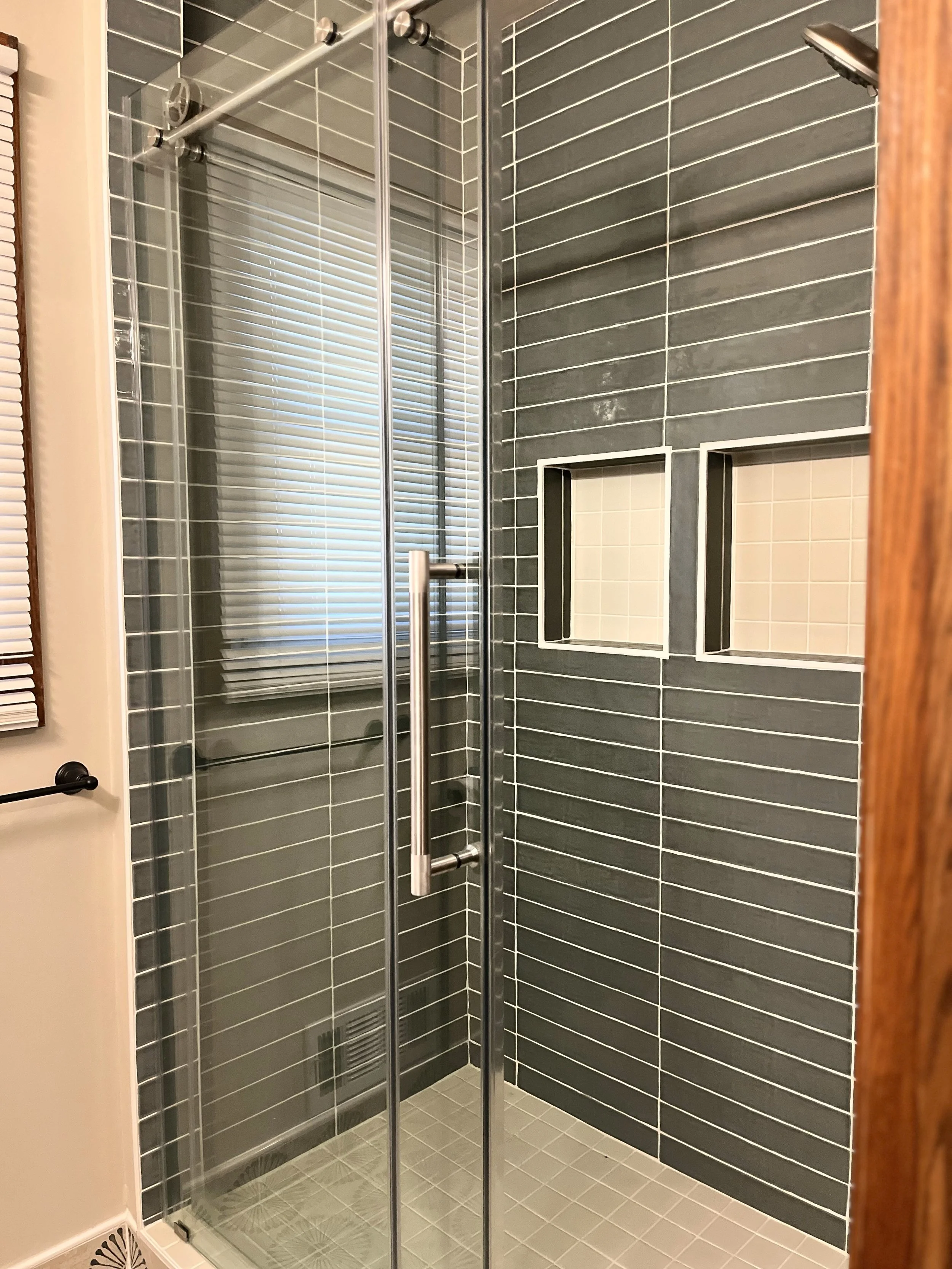 The primary bathroom of this 1950s mid-century home needed an affordable update. The dark, cave-like shower was transformed into a bright, airy space with a glass sliding door. The shower walls are tiled in a vibrant color, and two built-in niches provide storage for shampoo and soap. The floor tile complements the shower tile, and touches of wood add a warm, natural element to the space.